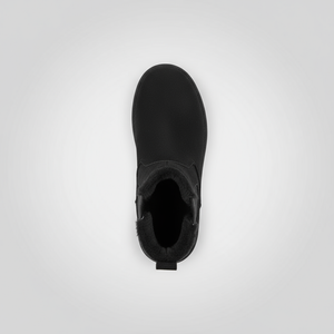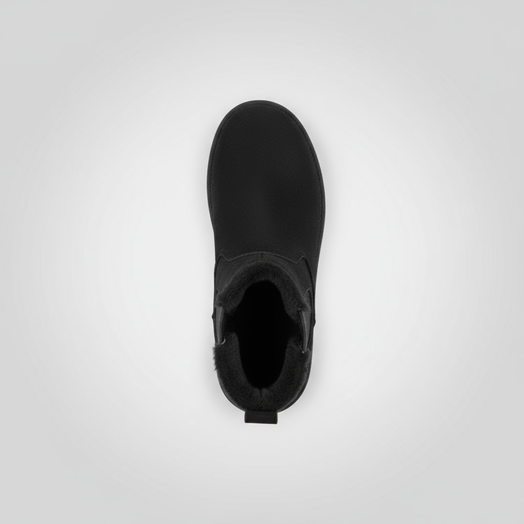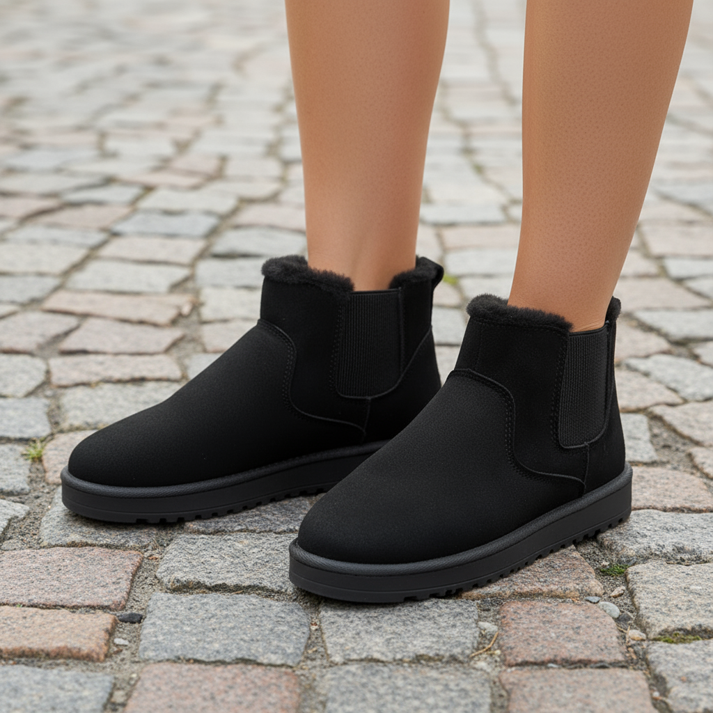 The boots combine a plush short-pile interior with a sleek artificial leather upper, finishing at the ankle for natural movement and flexibility. Their round-toe silhouette ensures all-day comfort, while the ridged rubber sole adds reliable traction in snow and on icy ground. Elastic side panels and a back pull-tab allow you to slide them on with ease, making them as practical as they are stylish.