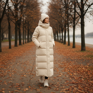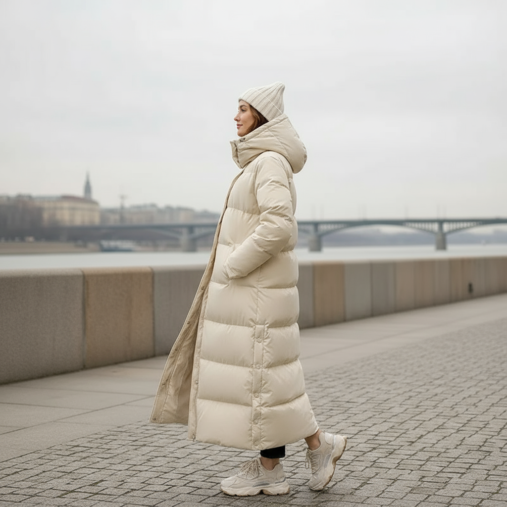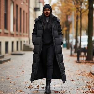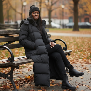 Designed for cold city mornings and weekend escapes, this long quilted puffer jacket by Elenya combines warmth with understated style. The oversized silhouette makes it easy to layer over knits or tailored separates, while the full length adds extra coverage against winter winds. Its hood and quilted finish bring both comfort and practicality, making it a reliable outerwear piece for everyday wear.
