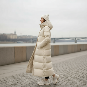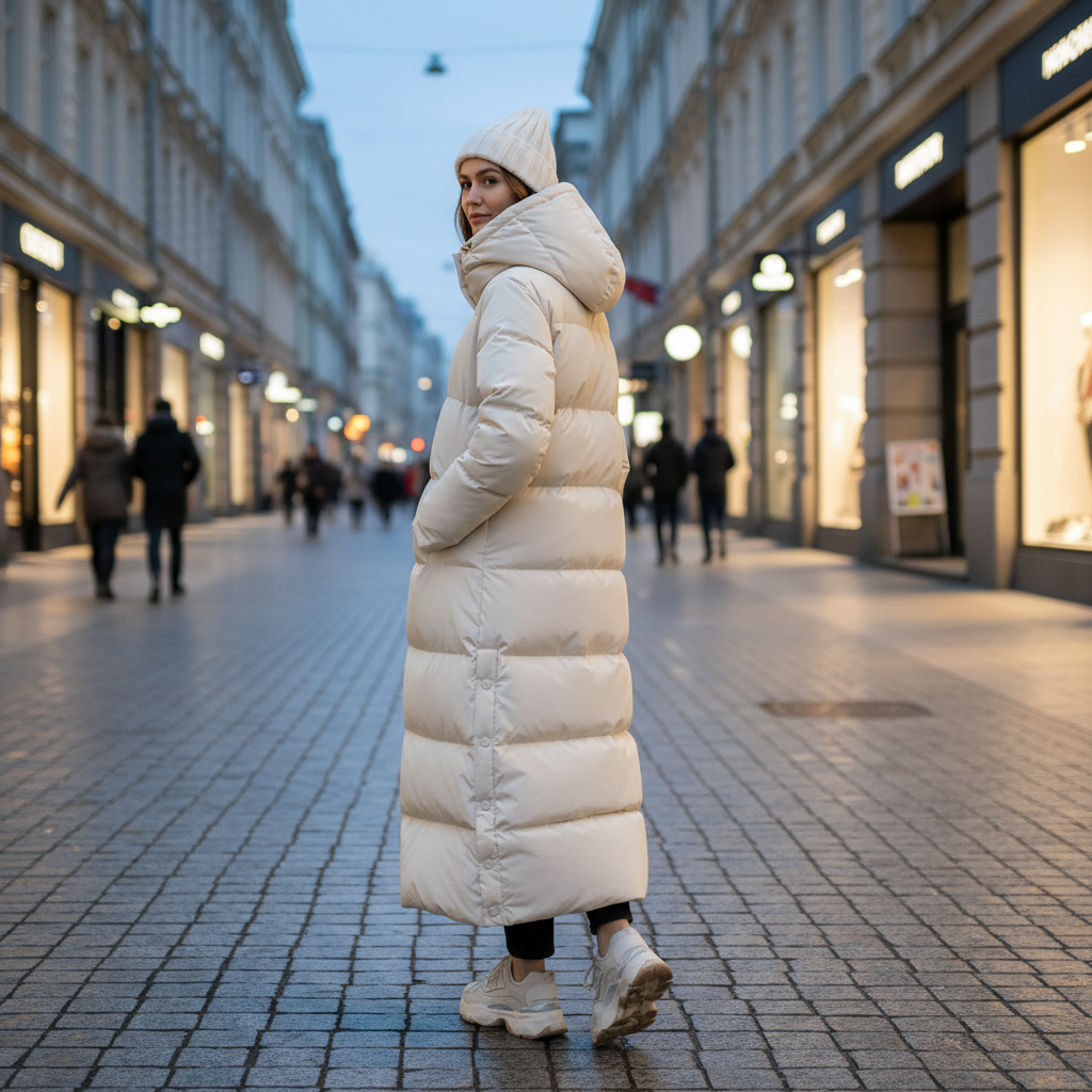 This jacket is built with movement and everyday flexibility in mind. The oversized cut offers comfort without compromising shape, while the extended length brings an element of ease and insulation. Thoughtful details like the full zip front, high collar, and spacious hood enhance its wearability, while discreet pocket placements and quilted texture add a refined finish. It transitions from casual outdoor looks with boots to city-ready layering over dresses or denim.