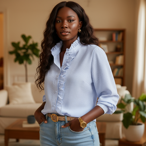 This blouse balances timeless stripes with considered design details that feel modern and versatile. The ruffled collar and placket add subtle dimension, while the buttoned front keeps it adaptable for different looks. Its long sleeves and light fabrication make it ideal across seasons, layering easily under a blazer or pairing simply with denim. Thoughtful and wearable, it adapts to both professional and relaxed settings.